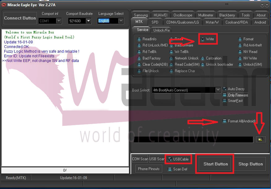 وبعد ذالك سنقوم بالضغط على Start Butlon وهذ الخيار ليبداء عملية سحب الفلاشة الان تقوم بايقاف الهاتف ثم الضغط على زر رفع الصوت وتضع كبل udb وتنتظر حتى يتم التعرف